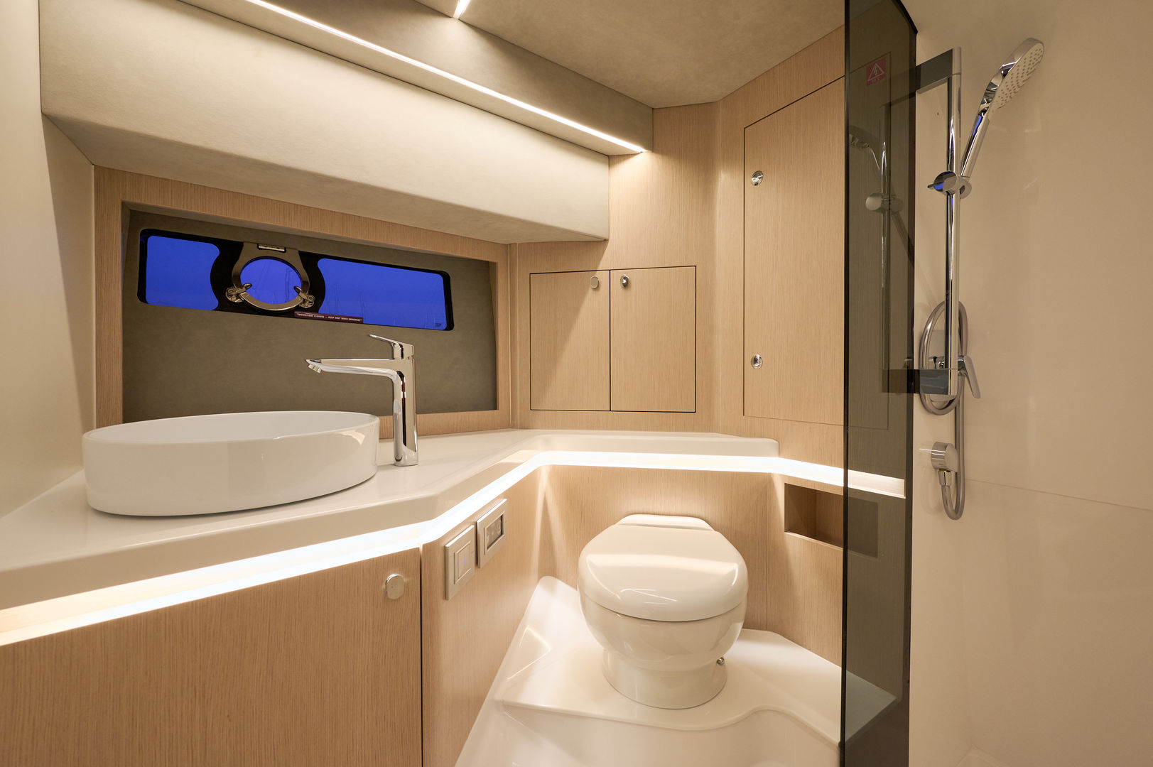 Sous le pont, l’aménagement soigné du Forza 37 offre une cabine principale élégante avec des finitions en bois noble et cuir. Une salle de bain avec douche séparée complète cet espace raffiné, assurant un confort absolu lors des croisières prolongées.